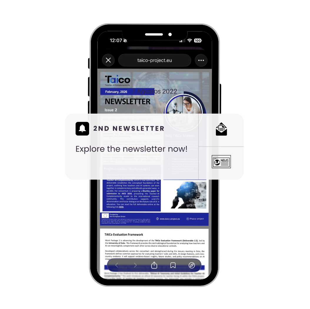 Welcome to TAICo: Shaping the Future of Teaching with AI! The TAICo (Teacher-AI Complementarity) project is now officially underway! Backed by the Horizon Europe programme, this ambitious, multi-country initiative is rethinking the role of Artificial Intelligence in education, not as a substitute for teachers, but as a powerful ally. In a time when digital transformation is accelerating, TAICo puts teachers at the centre of innovation, working to co-create ethical, practical, and empowering solutions for the use of AI that enhance, not undermine, educators’ skills, autonomy, and professional identity. Through collaborative research, real-life classroom studies, and close engagement with educators, EdTech experts, and policymakers, TAICo aims to shape a future where AI works with teachers, not around them, supporting high- quality, inclusive learning across Europe.